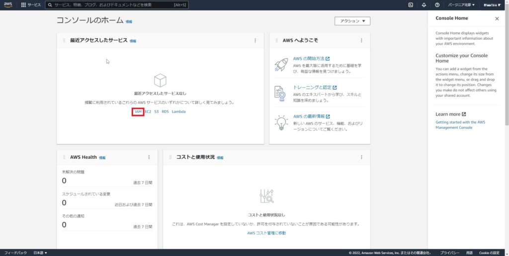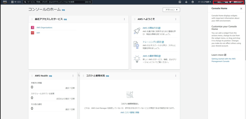 無事ログインできたら、コンソール画面が表示されます。画面右上にIAMユーザー名が表示されていると思います。