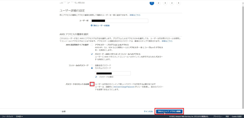 チェックを外しましょう。チェックを入れておくと、今回作成したIAMユーザでログインする際にパスワードの変更を求められます。