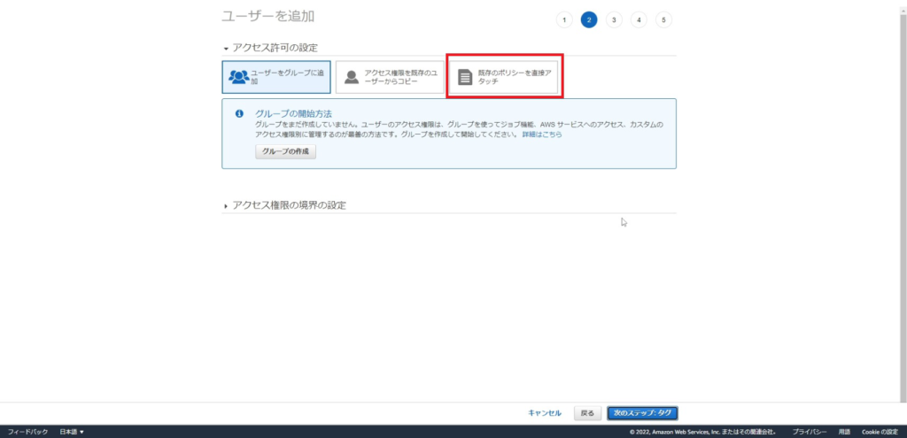 ここでは「既存のポリシーを直接アタッチ」をクリックします。