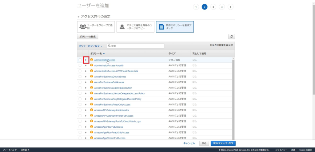 「AdministratorAccess」と書かれたポリシーの左にある矢印を押してみましょう。