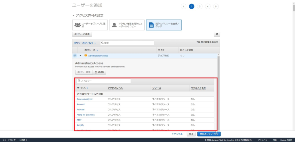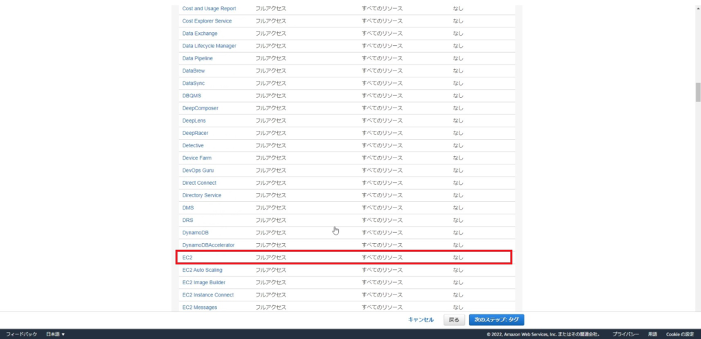 この後作成する「EC2」へのアクセス権もありました。今後EC2以外のサービスにも触れていく予定なので、このポリシーをアタッチするのが良さそうです。