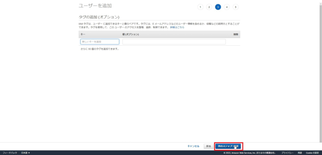 ポリシーの内容を確認したところで、チェックボックスにチェックを入れ、「次のステップ:タグ」ボタンを押しましょう。