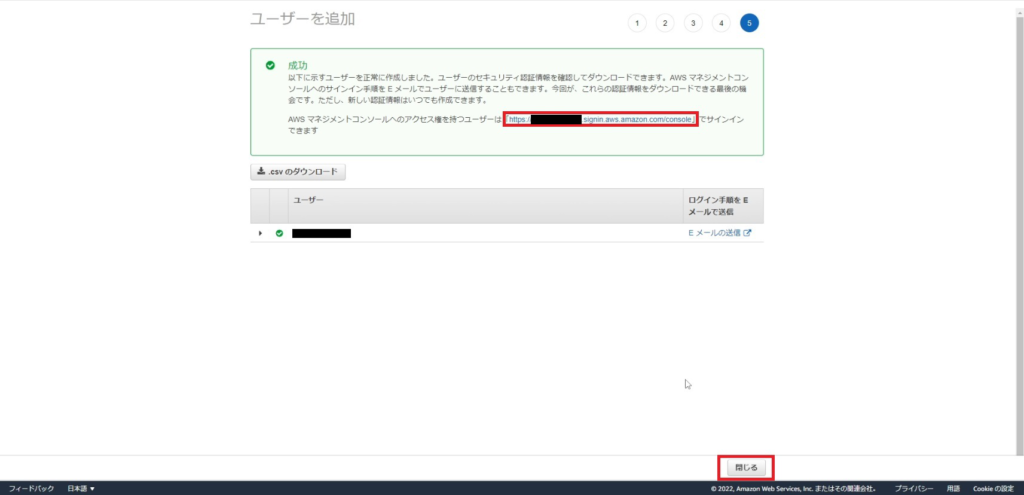 IAMユーザーでログインする場合は、赤枠のURLからログインすることになりますので控えておきましょう。