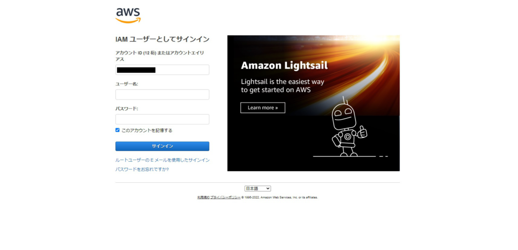 ユーザー名とパスワードに、今回作成したIAMユーザー名とコンソールのパスワードを入れて「サインイン」ボタンを押してみましょう。