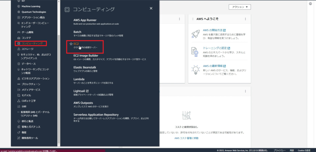 クリックするとAWSの様々なサービスが表示されます。その中から「コンピューティング」を探しクリックすると、「EC2」を見つけられると思います。見つけられたら「EC2」をクリックしましょう。