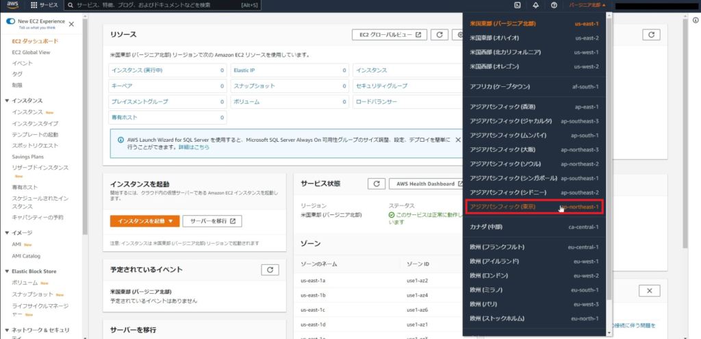 下の画面が表示されたら、画面右上でリージョン(地域)を変更しましょう。私は日本在住の純日本人なので「アジアパシフィック(東京)」を選択します。基本的に自分がEC2にアクセスする場所に近いリージョンを選ぶのが良いと思います。