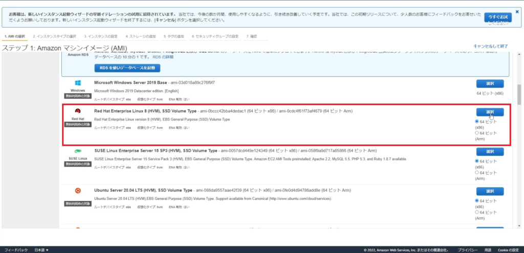 画面が切り替わると、最初はマシン選びです。無料利用枠でもたくさんのマシン(サーバー)が選べます。私は今回、「Red Hat Enterprise Linux8」を選択します。