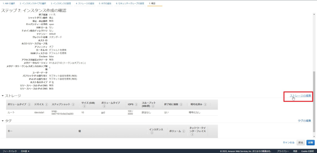 「インスタンス作成の確認」の画面に戻ったら、「ストレージの編集」をクリックします。