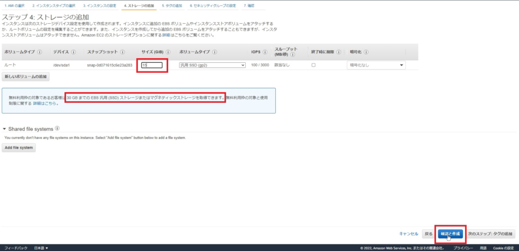 画面の説明にあるとおり、無料利用枠では30GBまで使用可能です。私は15GBに設定変更することにしました。設定が終わったら「確認と作成」ボタンを押しましょう。