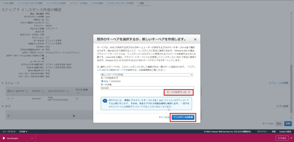 キーペア名まで入力したら「キーペアのダウンロード」ボタンを押しましょう。ファイル名がキーペア名のpemファイルがお手元にダウンロードされます。