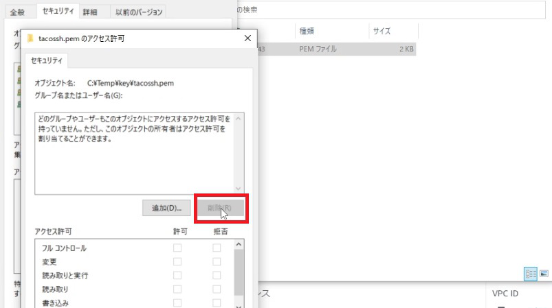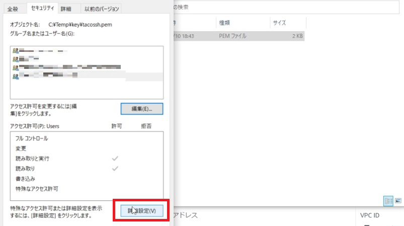 pemファイルを右クリックし、プロパティからセキュリティタブを選択し、詳細設定ボタンを押しましょう。