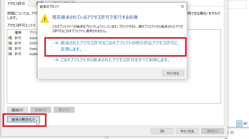 ボタンを押すと下のようなメッセージが表示されるので「継承されたアクセス許可をこのオブジェクトの明示的なアクセス許可に変換します。」をクリックします。