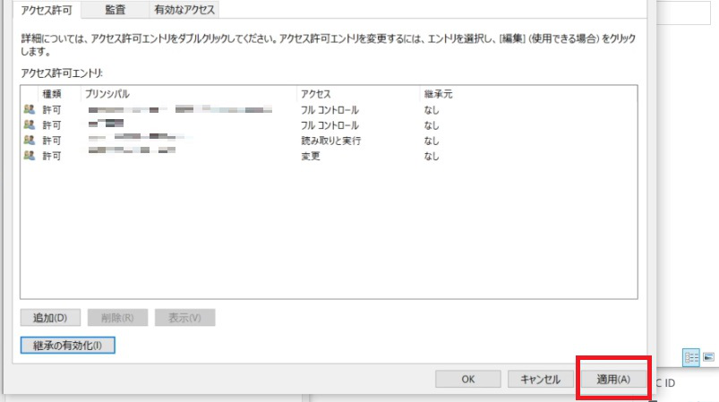 メッセージが消えたら「適用」ボタンと「OK」ボタンを押して、ファイルのプロパティ画面に戻ります。