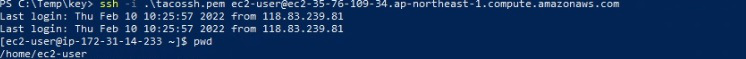 pemファイルの準備ができたら、PoweShellでsshコマンドを使いEC2にログインします。