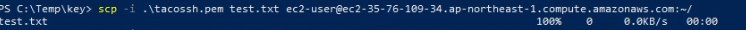 ※コマンド最後の「~/」は、サーバーのユーザーホームディレクトリを指しています。今回の場合だと、/home/ec2-user上にtest.txtファイルができます。